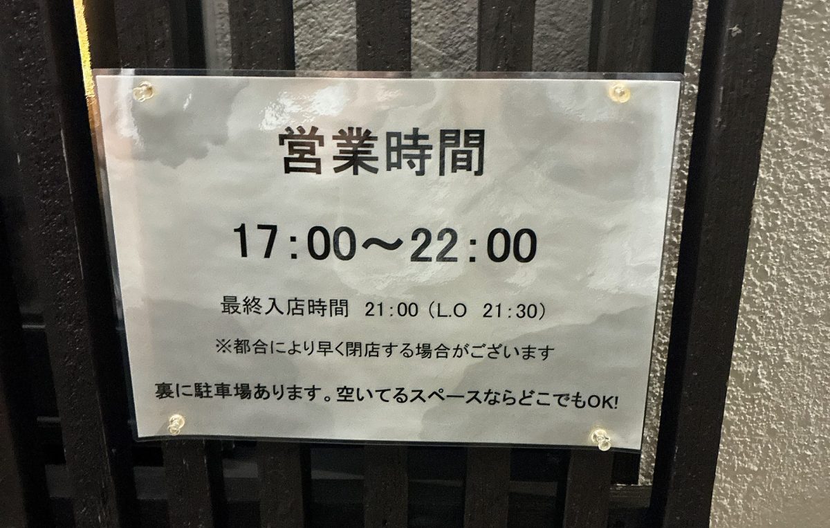 入口には営業時間の案内。ラスト入店は21時だそうです。