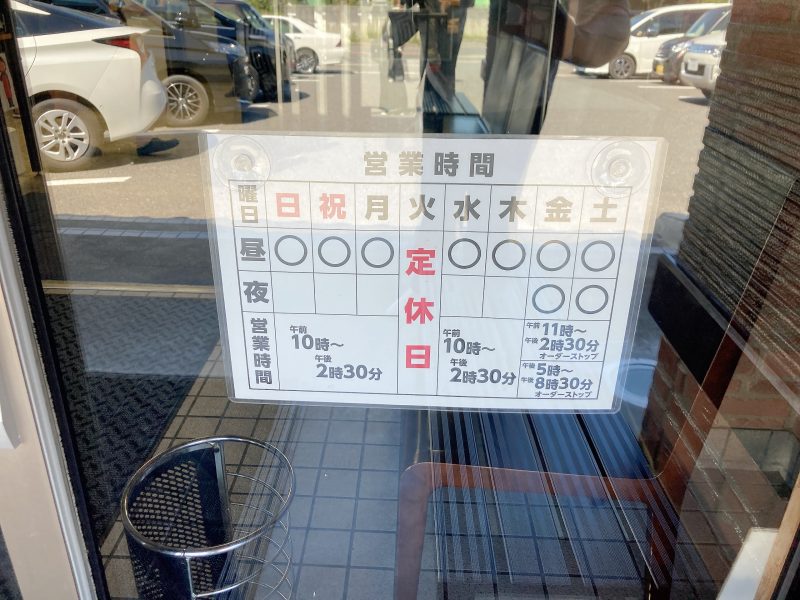 入口には営業時間のおしらせ!火曜日休みです。