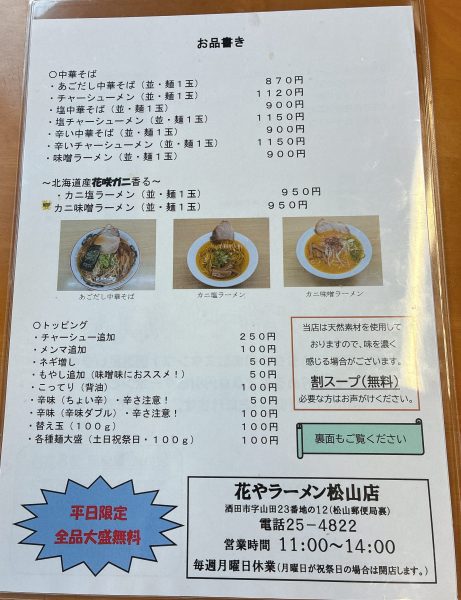 花やラーメン松山店のメニュー表